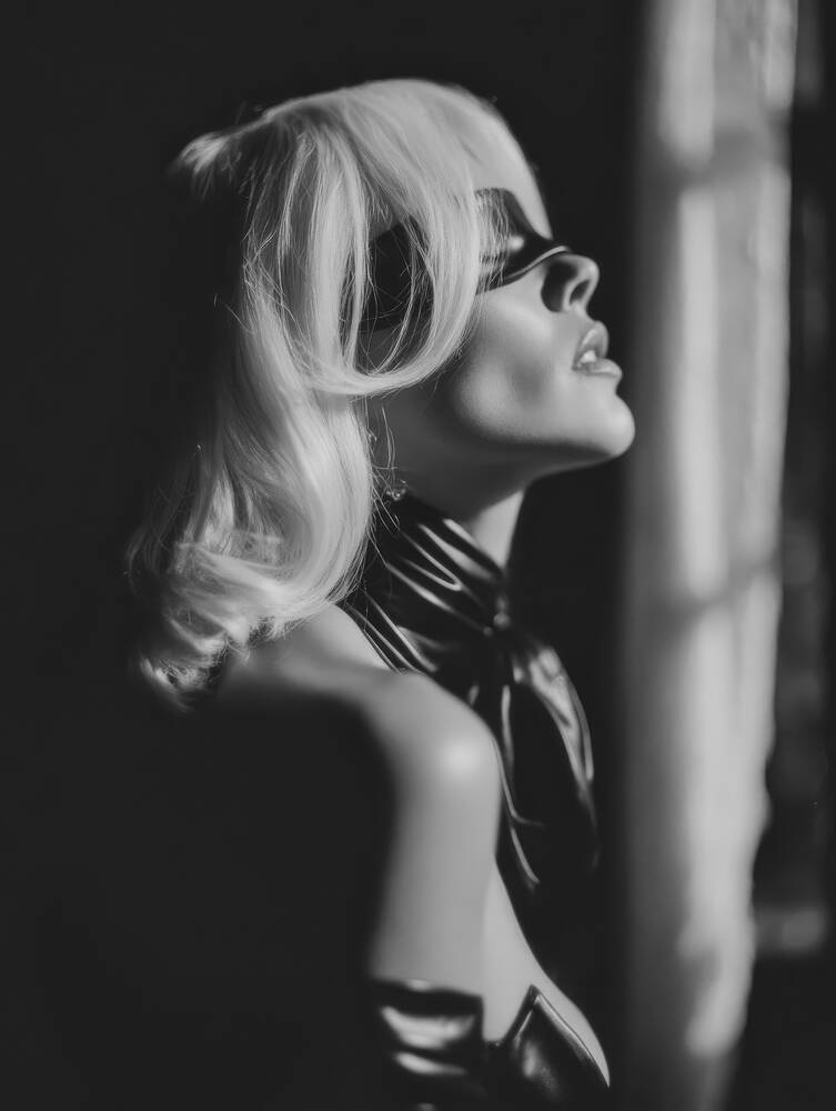 Black and White Environmental Portrait of a woman, wearing a black leather mask with blond hair