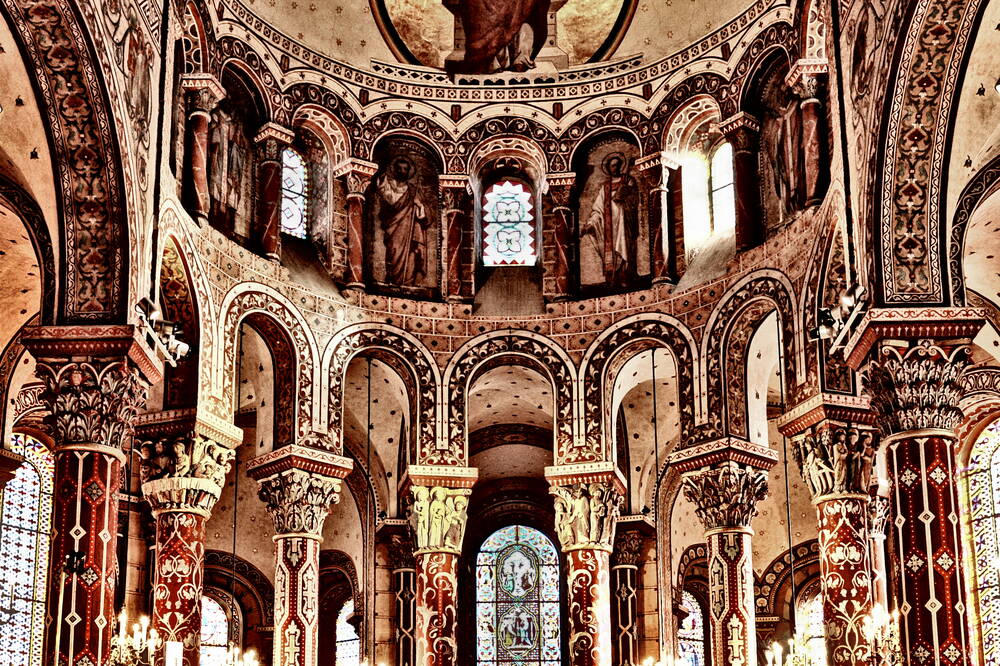 l'interno di una chiesa romanica in Auvergne dipinti sulle pareti e su ogni arco della volta un'architettura molto elaborata e un interno molto luminoso conferiscono a questa chiesa tutto il suo interessePersonalizza la foto