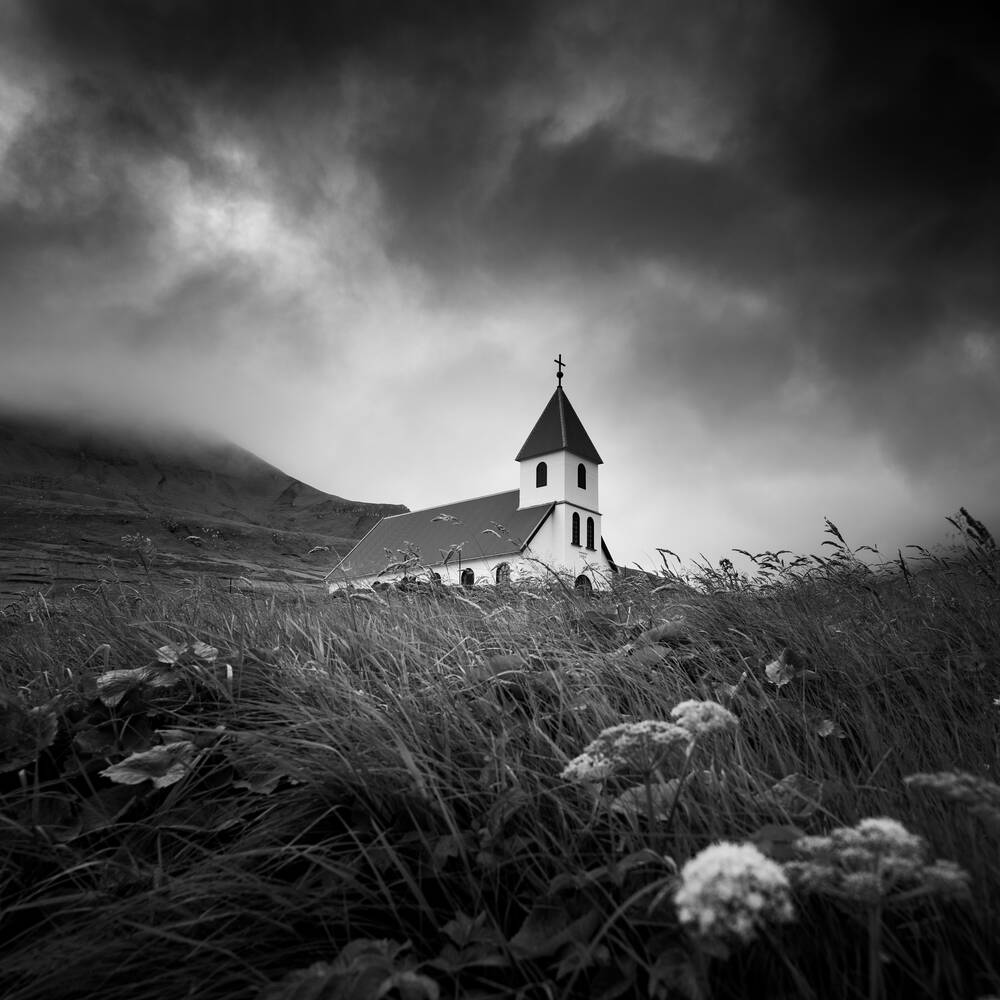 La chiesetta di Gjogv nelle Isole Faroe durante la tempesta