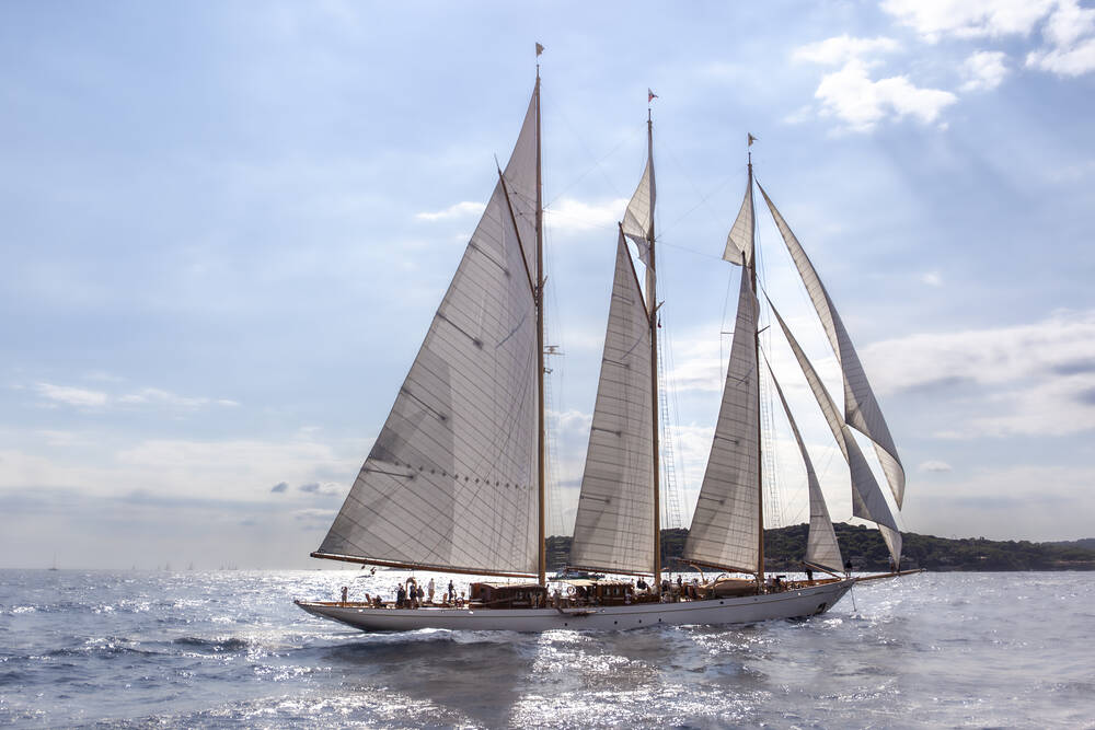 Questo maestoso yacht a vela tradizionale è un sogno galleggiante, un sussurro di storia che fende le onde blu.