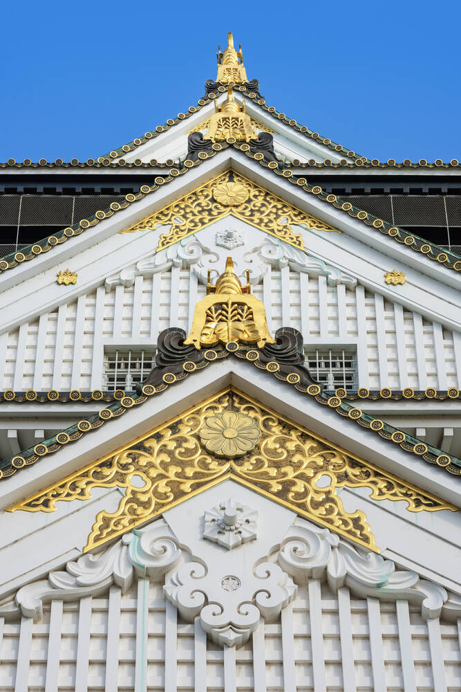 Japans kasteel in Osaka met een wit en gouden dak in Hafukazari stijl, versierd met Taiko chrysantentegels, shachihoko ornamenten en decoratieve gegyo gevels.
