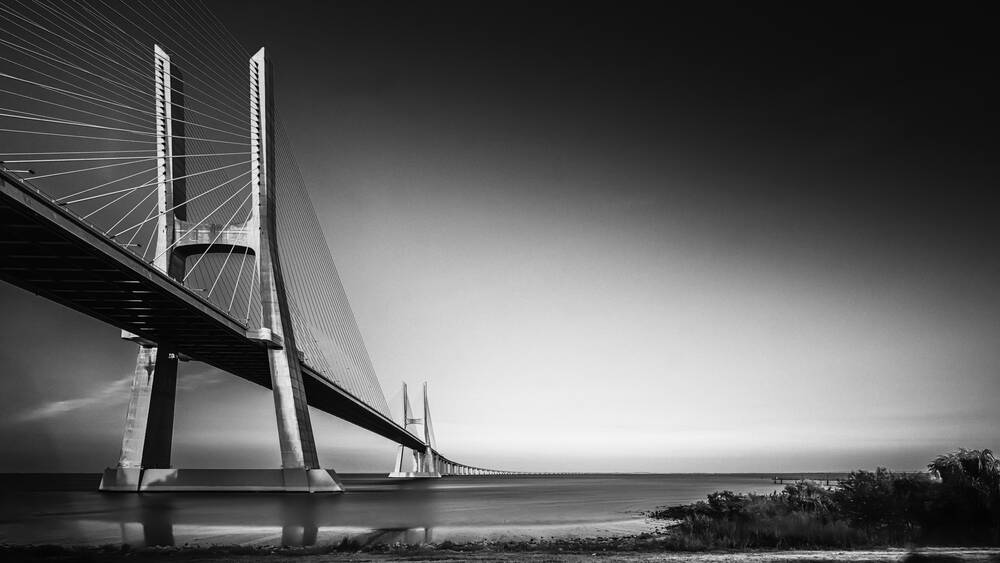 De Vasco de Gama brug in Lissabon, Portugal, 12 km boven de zee om twee kustlijnen te verbinden. Deze foto is aan het eind van de dag genomen met een lange belichtingstijd.Foto personaliseren