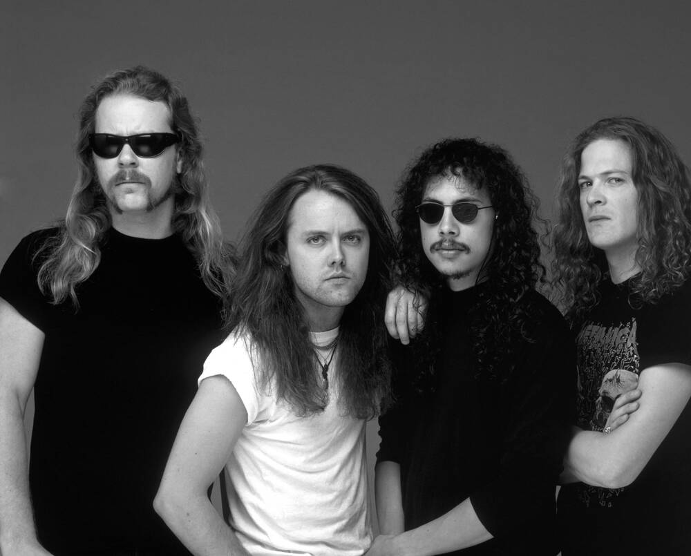 Van links naar rechts: zanger James Hetfield, drummer Lars Ulrich, gitarist Kirk Hammett en bassist Cliff Burton poseren voor een studioportret.