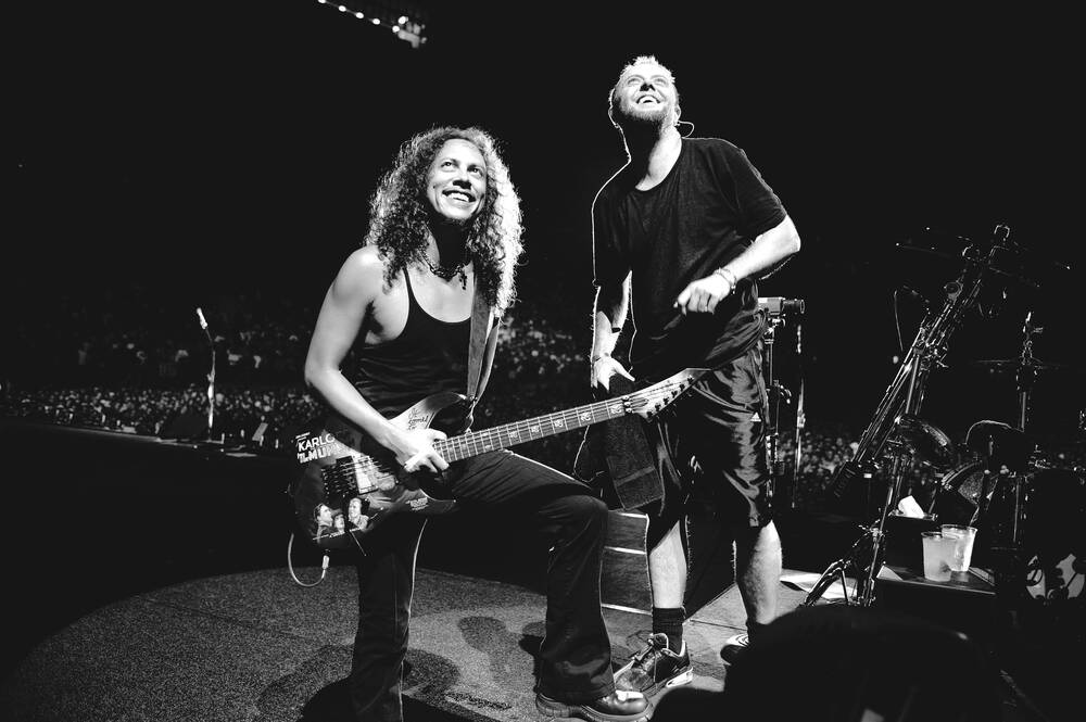 Op 20 juli 2003 zette Metallica het Amerikaanse podium in vuur en vlam tijdens hun nationale tournee, met de explosieve energie die zo kenmerkend is voor hun legendarische liveshows. Die avond legde Mick Hutson, gerenommeerd fotograaf en goede vriend van de band, de vurige momenten vast met zijn scherpe artistieke oog. Geschoten voor Bang magazine. Columbus, Ohio In de VS, Credit:Mick Hutson / Avalon