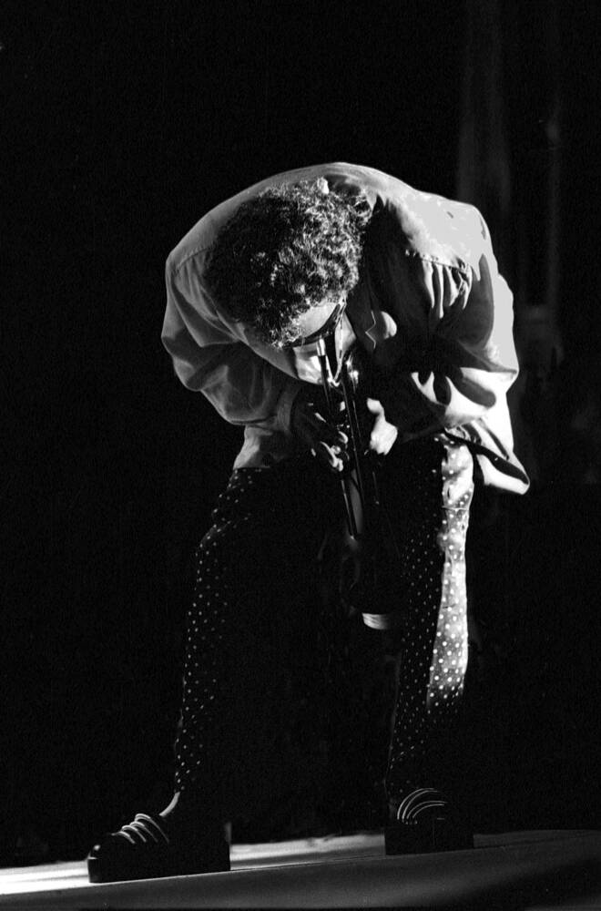 Miles Davis in concert op het Nîmes Jazz Festival in juli 1988. Foto van een gedigitaliseerd negatief.