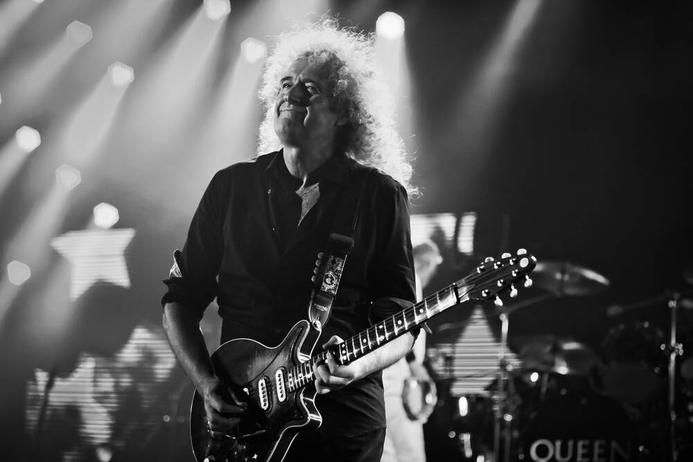 Legendarische Queen-gitarist Brian May op het podium van de Hammersmith Apollo