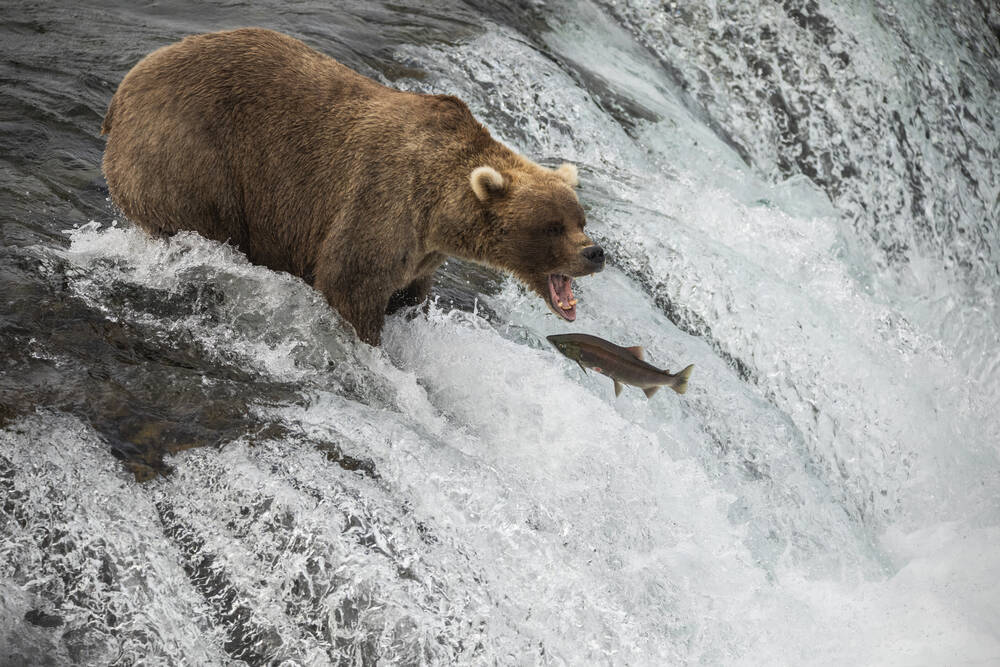 Een sterke volwassen grizzlybeer vist vanaf de top van de Brooks watervallen in Alaska.