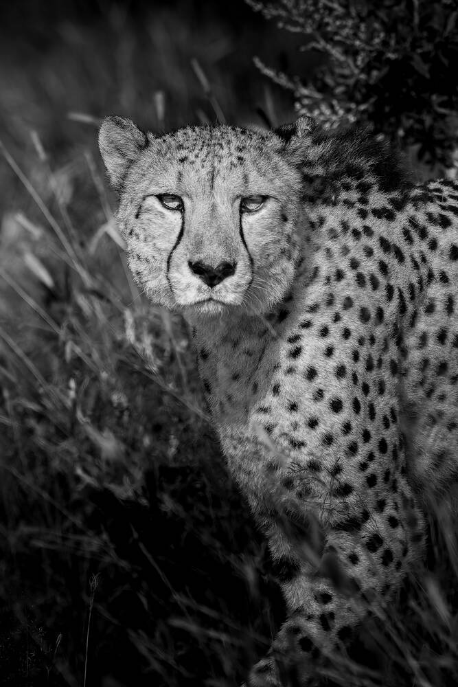 Close-up van het jachtluipaard met zijn diepe blik en de schoonheid van zijn vacht.
