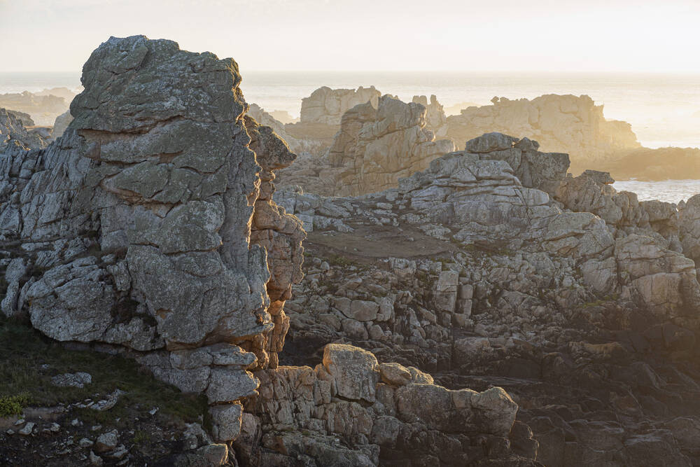 Frankrijk, Mer d'Iroise, eiland Ouessant, Finistère, rotsen ten noorden van Créac'h in de schemering, Regionaal Natuurpark Armorique, augustus 2025.