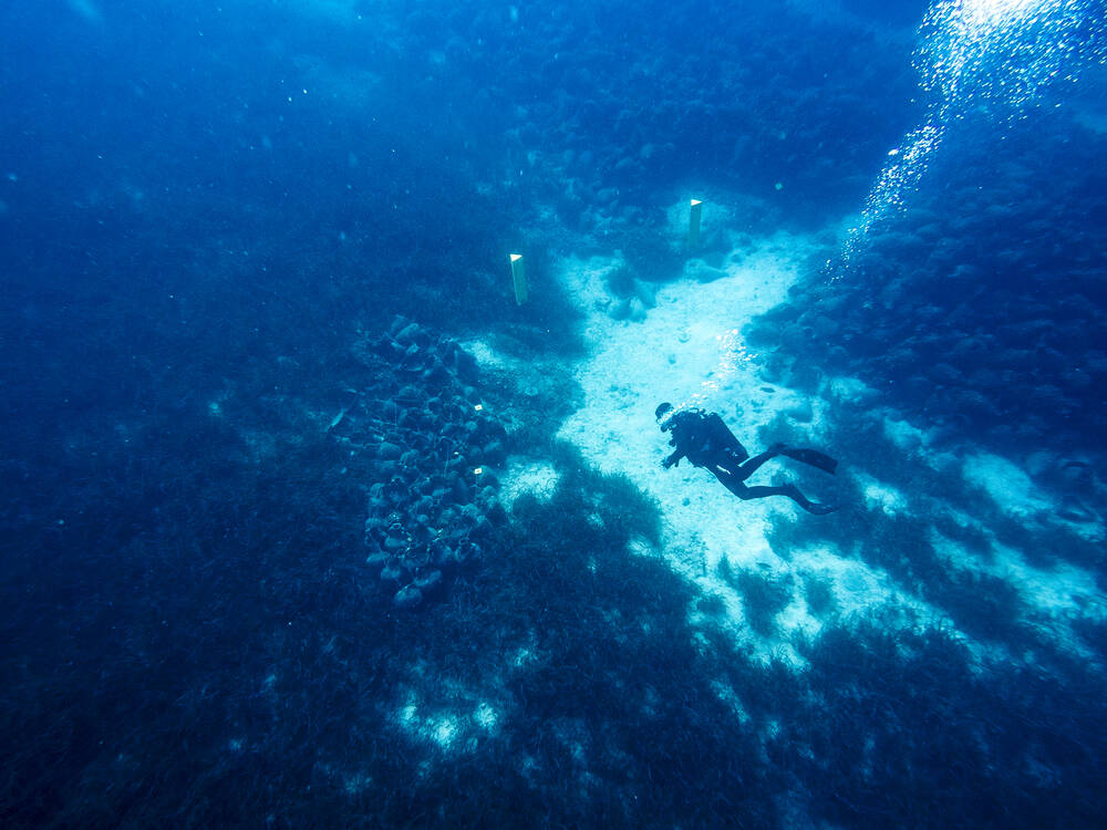 Griekenland, Sporaden, Alonissos, Péristéra onderwatermuseum van het antieke scheepswrak uit 500 v.Chr. Duiken tot -25 meter op de plek met de meeste amforen uit het wrak van een antiek schip