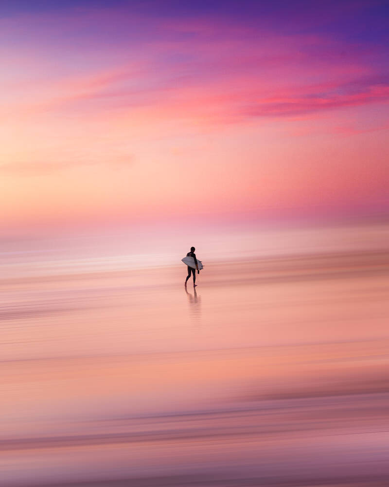 Een surfer loopt over het rozeachtige zand, badend in de weerspiegelingen van een pastelkleurige lucht in schakeringen van mauve en oranje. Alles lijkt wazig, zacht en stil. In Mirage vervaagt Thomas Fotomas de grenzen tussen lucht en zee, droom en werkelijkheid. Een contemplatief, zwevend beeld waarin de tijd lijkt te vervagen.Foto personaliseren