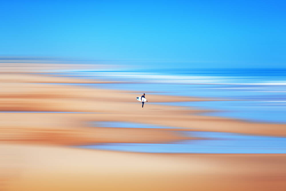 Wachten op de grote duik Een surfer loopt naar de oceaan, alleen op een strand met surrealistische weerspiegelingen. Water en zand smelten samen in een ballet van pasteltinten. Een puur, rustgevend beeld, waarin je de hartslag van anticipatie kunt voelen - vóór de eerste golf.
