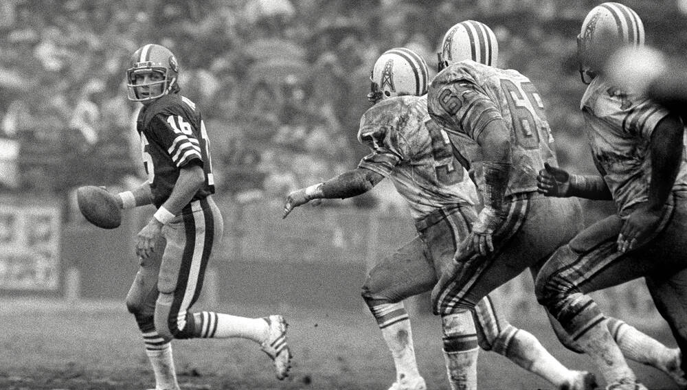 San Francisco 49ers vs. Houston Oilers bij Candlestick. 49ers verslaan Oilers met 28-6. San Francisco 49er Quarterback Joe Montana (16) ontsnapt aan de verdedigingslinie van Houston Oilers. 49ers 28:6 Oilers 13 december 1981 - San Francisco, Californië.