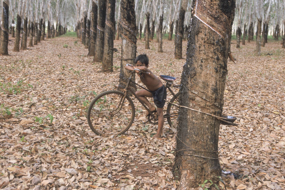 a little boy on his bicycle on a rubber plantation in CAMBODIA